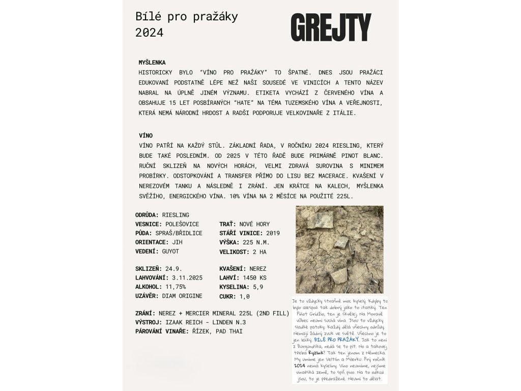Bílé pro Pražáky 2024 je charakteristický ryzlink od moravského vinařství Grejty, pocházející z viniční tratě Nové Hory v Polešovicích. Jedná se o první tiché víno v portfoliu Grejty, jehož tvorba klade důraz na čistotu projevu, terroir a výraz minerality. Hrozny byly vypěstovány na částečně břidlicovém podloží, které je pro Ryzlink rýnský zásadní a které vínu propůjčuje jedinečný minerální charakter. Část vína zrála v nerezových tancích, část pak v sudu typu Mercier Mineral, který tvoří přibližně 10 % výsledného blendu a dodává vínu jemnou strukturu a ovocnou hloubku.