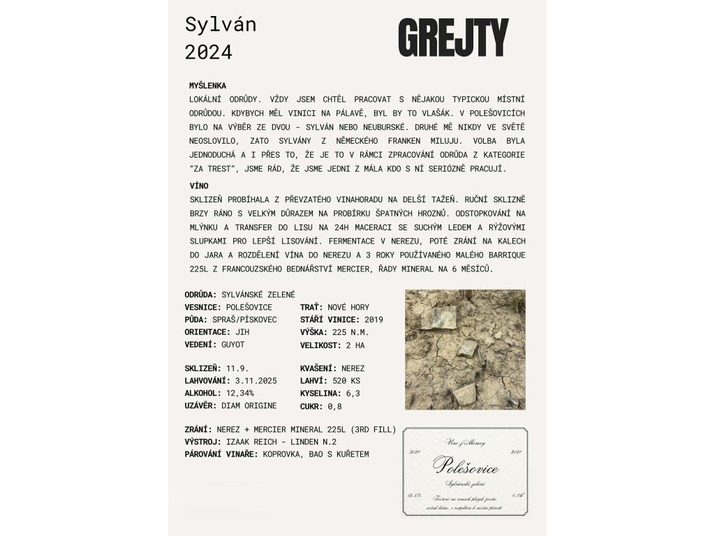 Sylvánské zelené od vinařství Grejty je suché bílé víno vzniklé z ručně sbíraných hroznů stejnojmenné odrůdy, která je na Slovácku tradičně pěstována a velmi oblíbená. Víno vzniká s důrazem na přirozený projev terroiru, svěžest kyselin a čistotu odrůdového charakteru bez zbytečných aromatických zásahů.